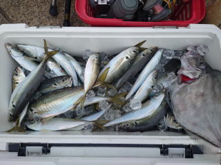 2番手58尾。 中アジ主体でダブル・トリプルあり 釣れました。 当店では通年130号ビシ |